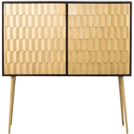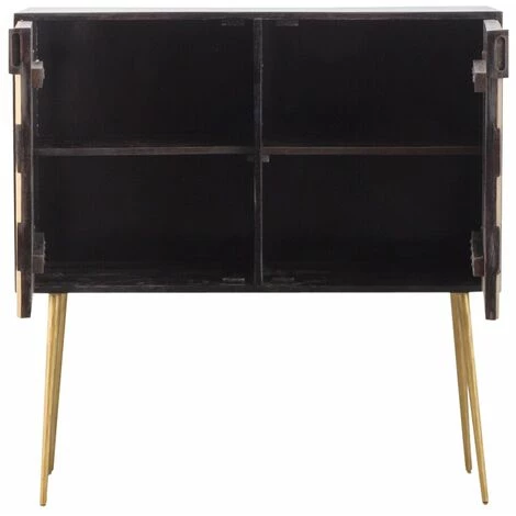 Il est réalisé à partir de matériaux de qualité à savoir ; le bois de manguier. Le contour du meuble dispose d’une patine teintée noire quant aux façades de portes, elles sont également en bois et patiné doré. Il saura satisfaire les petits espaces en proposant un meuble tendance capable de stocker. Ce buffet haut mettra l’accent sur le rangement en vous proposant des espaces de stockage définis. Derrière ses 2 portes, vous trouverez 2 étagères amovibles capables de stoker de la vaisselle dans une salle à manger, ou pouvant accueillir vinyles et bouquins dans un salon. Ce nouvel objet déco d’esprit rétro fait un sans-faute !