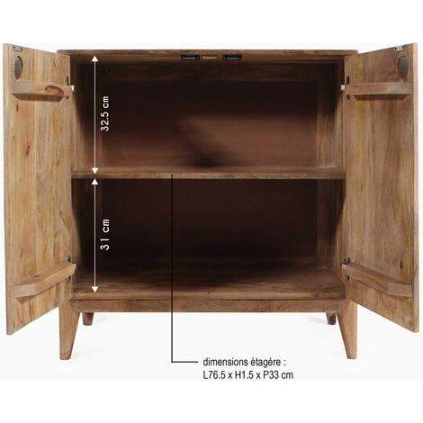 Ce buffet bois massif se démarque grâce à ses dimensions atypiques, plus petit qu’un buffet traditionnel, il saura satisfaire les petits espaces en proposant un meuble tendance capable de stocker. Ses dimensions très arrangeantes ainsi que ses traits fins sont des caractéristiques qui personnalisent ce buffet. Côté rangement, derrière ses 2 portes battantes se loge une étagère fixe qui vous permettra d’organiser votre rangement.