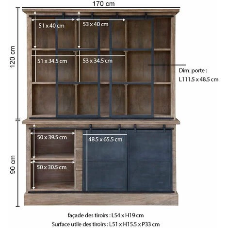– Profondeur des étagères partie basse : 36.5 cm / Partie haute : 34 cm – Placer la partie haute sur la partie basse – Livré en deux colis.