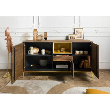 Neben den schlanken, goldenen Metallfüßen wird dabei das ebenfalls golden lackierte, offene Fach zum Highlight der Kommode. Hier lassen sich Designobjekte oder schönes Geschirr effektvoll präsentieren. Hinter drei Türen und in der kleinen Schublade – allesamt mit Push-To-Open versehen – findet sich noch mehr Stauraum für kleine und große Dinge.