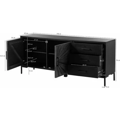Im Inneren der Kommode findet sich eine Menge Platz zum Verstauen und Ordnen von Alltagsgegenständen aller Art. Dafür sorgen neben vier Fächern hinter den verzierten Holztüren drei Schubladen, die sich auf der rechten Sideboard-Seite befinden. Die große Deckplatte lässt sich wie ein breites Regal nutzen – zum stilvollen Präsentieren von Büchern, Vasen oder weiteren Deko-Artikeln.