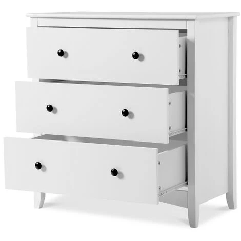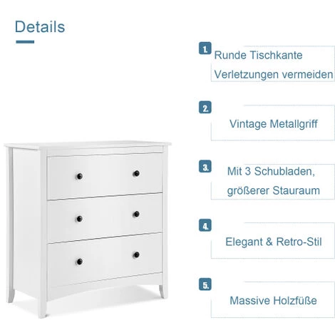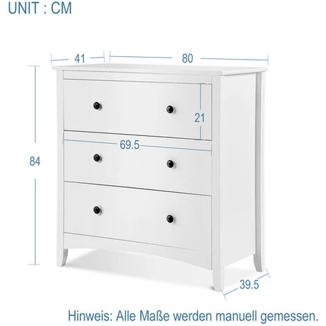 Dimensions & DetailsDimensions: 80x41x84cmMateriaux: Forces de defense principaleDimensions du colis: 91x49x23.5 cmInstructions de montage: Installe a l’avancePoids net / brut: 26.8 / 28.2 kgCapacite de chargementTiroir simple, plateau superieur?: 20?kgTotal?: 80?kgCaracteristiquesElegant & style: Cette commode au fini blanc mat gracieux, aux lignes epurees et a la base incurvee unique. Peinture ecologique qui repond pleinement aux normes britanniques sur les meubles pour enfants. L’aspect elegant et epoustouflant ne se demodera jamais dans votre chambre a coucher, chambre d’enfant, etc.Grand rangement et solide: 4 tiroirs spacieux pour un rangement pratique de toutes les choses importantes. Fabrique a partir de MDF de haute qualite et de bois de peuplier massif, de boutons en metal vintage et de rails en metal renforce. Suffisamment robuste et durable pour une utilisation a long terme.Conception de securite: Peinture ecologique qui repond pleinement aux normes britanniques sur les meubles pour enfants. Le design rond et la conception ANTI-BASCULEMENT de la table vous garantissent une securite maximale.Livraison rapide et gratuite: Emballage plat pour un assemblage facile a domicile, les instructions et les fixations sont incluses.Un ajout etonnant et fonctionnel a votre chambre a coucher avec un espace de rangement spacieux. Le design minimaliste et neutre s’integre parfaitement a n’importe quel interieur.Construit en MDF solide et epais et en bois de peuplier massif, suffisamment robuste et durable pour une utilisation durable.Securite maximale. La couleur est entierement conforme aux normes britanniques en matiere de meubles pour enfants. Le design rond de la table et la conception ANTI-BASCULEMENT garantissent une securite maximale.Livre a plat pour un assemblage facile a domicile. Les instructions et les fixations sont incluses.80x41x84cm (LxPxH); Dimension interieure du tiroir : 65 x 32,5 x 14,2 cm (L x P x H) ; P.G. : 28,2 kg.