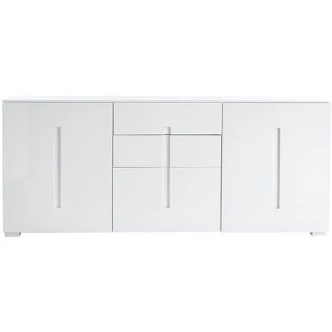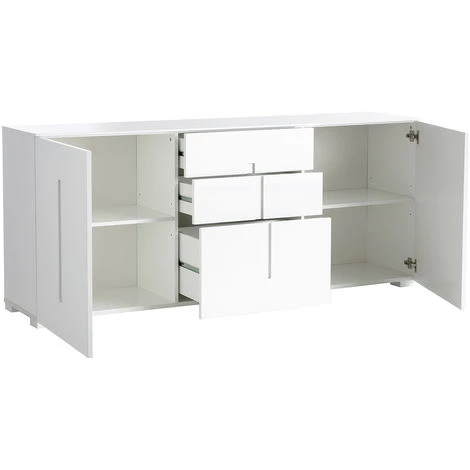 Avec des dimensions importantes, ce buffet TED possède de multiples rangements. Dans chaque extrémités, deux grandes niches sont dotées d’une étagères réglables sur 3 hauteurs. Ces rangements sont idéaux pour déposer assiettes, verres ou porcelaine. L’espace central se compose de 3 tiroirs dont deux de la même taille (L59 x P34 x H18 cm) et un plus grand situé dans la partie basse du meuble (L59 x P34 x H36 cm) idéal pour ranger des plats. Les portes ainsi que les tiroirs s’ouvrent à l’aide de l’ouverture design dessinée sur la façade du buffet.