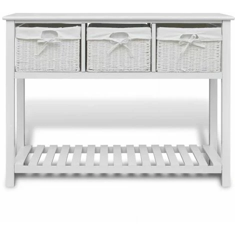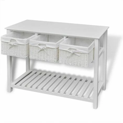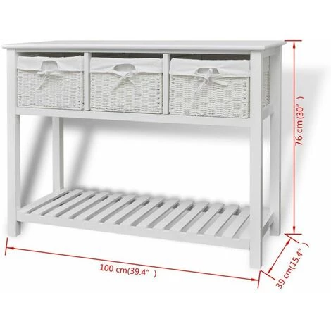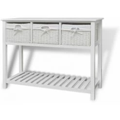 Ce buffet blanc de rangement, minimaliste romantique, avec paniers tissés présente une excellente solution de rangement pour la chambre à coucher, le couloir ou la salle de bain. Cette unité de stockage, faite de matériau de haute qualité, a trois paniers tissés et un niveau inférieur en lattes. Chaque panier a une doublure en tissu lavable. Les lattes aident à garder les articles stockés, ventilés et secs. Cette unité de rangement en bois deviendra l’un de vos meubles préférés !