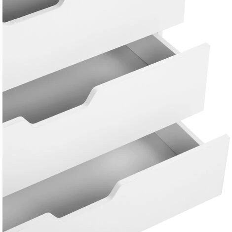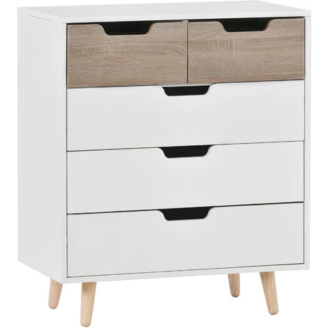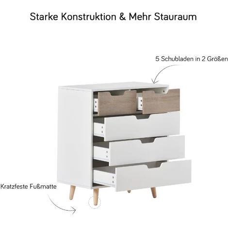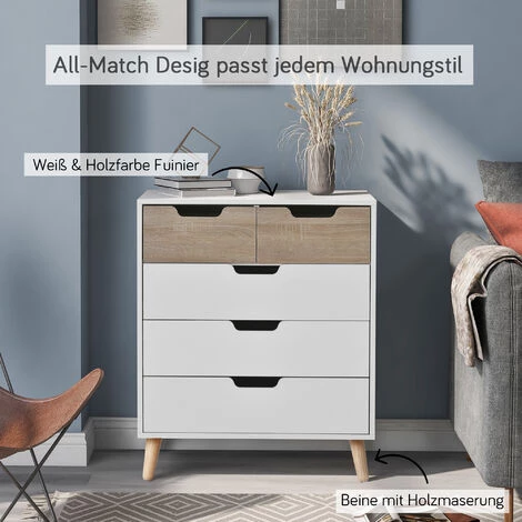 Conception intemporelleLa combinaison du blanc blanc mat et de la couleur du bois naturel est conçue pour tous les intérieurs, ce buffet peut très bien s’agencer à vos meubles existants. La conception fine en fait un point culminant de votre maison.Capacité étendueCe buffet est équipé de 5 tiroirs en 2 tailles, ce qui offre un espace de rangement variable pour des objets de différentes tailles. Vous pouvez placer de petites décorations sur la surface.Expérience utilisateur idéaleTiroirs au fonctionnement fluide, conception ingénieuse des poignées encastrées, accès facile aux objets. Des plaques en plastique sous les pieds protègent le sol des rayures. 4 pieds en bois massif peuvent supporter de manière stable l’ensemble de l’armoire.Matériel haut de gammeCe produit est fabriqué à partir de MDF de classe E1, qui est durable et respectueux de l’environnement. Les pieds sont en bois massif, peuvent rester stables sur le sol et ont une bonne capacité de charge. Un rail robuste est utilisé pour une ouverture et une fermeture silencieuses et en douceur des tiroirs.Montage et nettoyage facilesPour les soins quotidiens, il suffit d’essuyer avec un chiffon humide. Des instructions détaillées et les outils nécessaires sont inclus dans l’emballage. Le produit est mieux installé par 2 personnes.5 points fortsDesign classique : la tonalité de couleur combine le blanc et le chêne, qui se marie bien avec presque tous les styles de décoration d’intérieur.Espace de rangement variable : Le rangement peut être réalisé avec 5 tiroirs de différentes tailles. C’est une bonne aide pour garder votre maison bien rangée.Longévité : construction durable, pieds de table robustes, bonne peinture, MDF sélectionné.Haute qualité : poignée encastrée sans bavures, matériau en bois de haute qualité, excellent rail, tout est fait pour une expérience d’utilisation confortable.Facile à construire et à entretenir : vous n’avez besoin que d’un chiffon humide pour le nettoyage quotidien. Les instructions de montage sont incluses, tous les accessoires sont marqués de numéros.