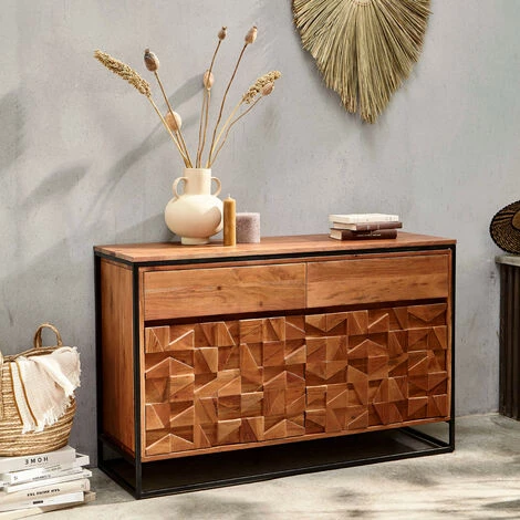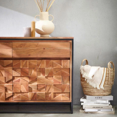 Vous recherchez activement un buffet conjuguant praticité, longévité et design alléchant ? Craquez pour les nombreuses qualités du buffet LETELS double porte et double tiroir. Vos enfants disposent d’une collection immense de jeux vidéo ? Grâce aux 4 espaces de rangement du buffet LETELS, vous n’aurez aucune difficulté à optimiser l’espace dans votre logement. Aussi, les portes et les tiroirs du buffet sont dotés d’ouverture dans la rainure des portes pour faciliter leur utilisation. Au-delà de son aspect pratique, le buffet LETELS est un véritable investissement à long terme. Composé de bois d’acacia massif, une essence de bois appréciée pour son excellente résistance et sa longévité, le buffet LETELS dispose d’une durée de vie inégalable. Cette longévité s’explique notamment par la faible teneur en humidité de l’acacia, assurant ainsi une excellente stabilité au bois dans le temps. D’un point de vue esthétique, le buffet est un meuble de rangement qui sort de l’ordinaire : entre ses reflets dorés et ses formes géométriques qui donnent du relief à l’ensemble, la déception n’est pas en option avec le buffet LETELS ! Dimension : 119 x 40 x 75 cm