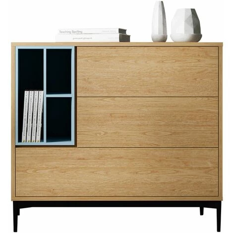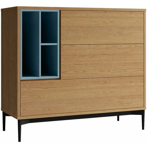 Lorsque vous pensez Ă des buffets, vous pensez probablement Ă un rangement utile pour mettre la vaisselle, les verres et les nappes juste Ă cĂŽtĂ© de l’endroit oĂč vous les utilisez. Cependant, il n’y a aucune raison pour que vous ne puissiez pas y ranger autre chose. Que ce soit dans le salon, dans la chambre ou mĂȘme dans votre bureau. Tirez le meilleur parti de votre espace sans perdre une once de style! PĂ€rumm, c’est un design avant-gardiste sans oublier la fonctionnalitĂ© originale du mobilier. La qualitĂ© et l’excellence des matĂ©riaux que nous utilisons sont gage de qualitĂ© dans toutes nos collections. Nous sommes spĂ©cialiste dans le mobilier fonctionnel et l’installation facile afin que vous puissiez en profiter dĂšs le premier instant. Dimensions: 103 x 40 x 95 cm MatĂ©riaux: contreplaquĂ© en bois laquĂ©. Structure des pieds en mĂ©tal noir. Couleur: Bois et bleu. Buffet avec 6 espaces de rangement, dont deux tiroirs. Parfait comme solution de rangement grĂące Ă sa polyvalence lorsqu’il s’agit de placer les meubles dans diffĂ©rentes piĂšces. Meuble en Kit. DifficultĂ© de montage: Moyen-Haut.