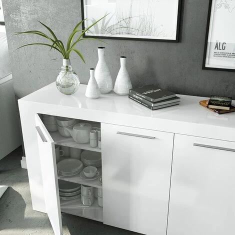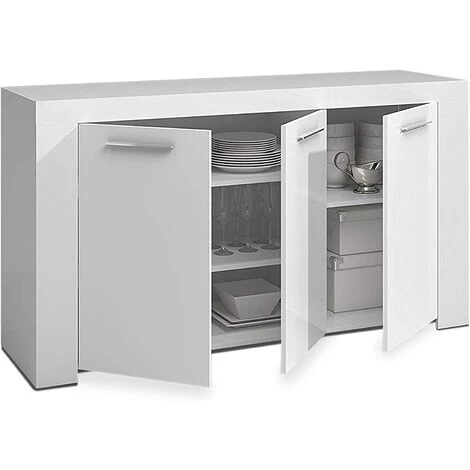 Buffet meuble de salle à manger décor blanc Artic conçu en panneaux de particules mélamine de haute qualité avec 3 portes, 3 tablettes et une niche de rangement. un design contemporain qui apportera une touche de modernité dans une chambre, un salon ou bien encore dans une entrée ! Dimensions : Largeur 144 cm x Hauteur 80 x Profondeur 42 cm. Poids : 44.49 kg. Meuble en kit facile à monter. Fourni avec les instructions de montage et les outils correspondants pour un assemblage optimal.Produit certifié PEFC (association espagnole pour la durabilité des forêts).