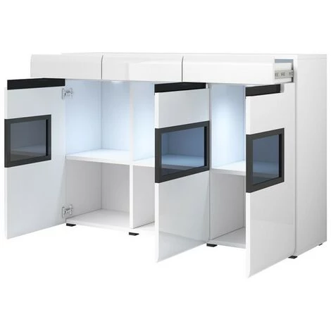 – CARACTÉRISTIQUES : Buffet partiellement vitrées, éclairage LED intégré. 6 espaces de rangement derrière les 3 portes. 3 tiroirs sur le haut du buffet.