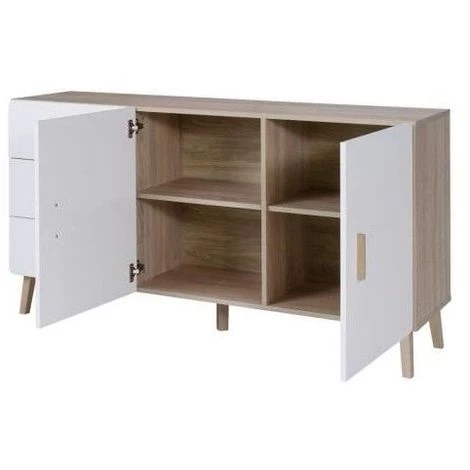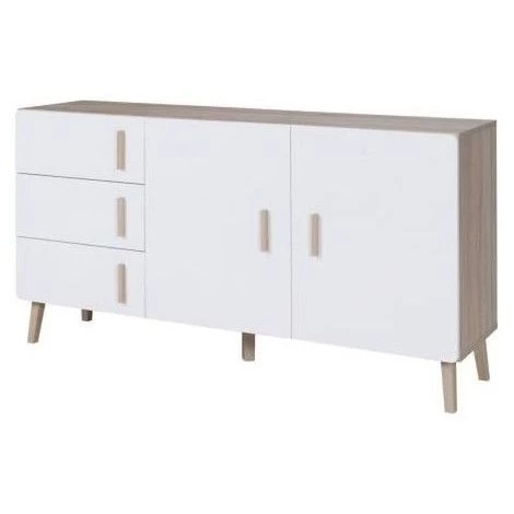 Buffet, bahut, enfilade OSLO – DIMENSIONS : 149x78x40 cm – COLORIS : oak naturel et blanc mat – STRUCTURE : Panneaux de particules, Bois massif – MATIÈRE DU REVÊTEMENT : Papier décor – TYPE : Scandinave, vintage, moderne et tendance – COMPOSITION : 2 portes et 3 tiroirs avec les coins arrondis – PIEDS : incurvés en bois massif – POINTS FORTS : Grand volume pour stocker votre vaisselle.