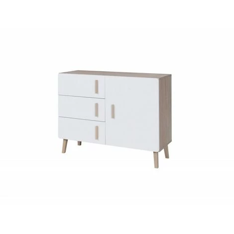 Buffet, enfilade, bahut de la collection OSLO. DIMENSIONS : 100x78x40 cm – COLORIS : oak naturel et blanc mat – STRUCTURE : Panneaux de particules, Bois massif – MATIÈRE DU REVÊTEMENT : Papier décor – TYPE : Scandinave, vintage, moderne et tendance – COMPOSITION : 1 porte et 3 tiroirs avec les coins arrondis aux extrémité – PIEDS : incurvés en bois massif – POINTS FORTS : Grand volume pour stocker votre vaisselle.