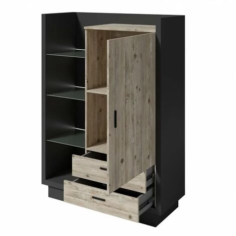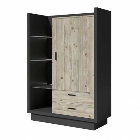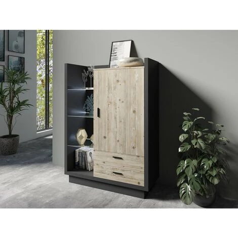 Buffet haut CORK composé d’une porte, 2 tiroirs et de 3 étagères avec LED intégrées. Coloris Gris anthracite et aspect pin.