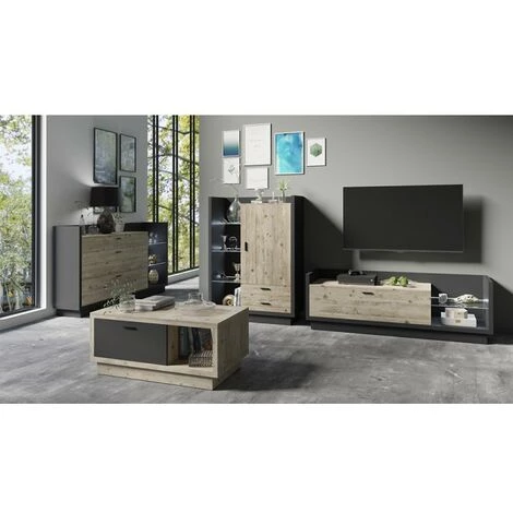 – COLORIS : Corps du meuble gris anthracite. Façade porte et tiroir aspect pin. Étagère en verre.