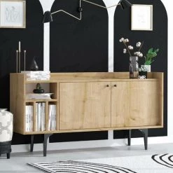 COTECOSY Buffet Bas 6 Portes Avec étagère Dyna 180cm Bois Noir Et Chêne – Chêne Clair
