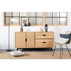 HELLIN Buffet Bas Scandinave En Chêne Blanchi 4 Tiroirs 1 Porte Coulissante – ALISIA – Bois Clair