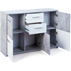 LES TENDANCES Commode 3 Portes 2 Tiroirs Mélaminé Blanc Et Effet Béton Flav