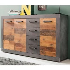 LES TENDANCES Commode 3 Portes 4 Tiroirs Mélaminé Chêne Foncé Et Gris Orcel