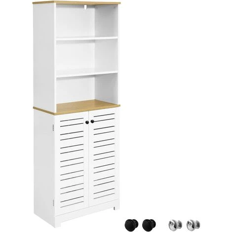 SoBuy BZR44-W Meuble Colonne de Salle de Bain Une solution simple pour optimiser le rangement dans votre salle de bain. Il peut également être utilisé comme étagère ou bibiothèque placé dans un salon, bureau, etc.3 étagères ouvertes et 2 étagères réglable en hauteur derrière les portes sont pour des serviettes, papier toilette et autres ustensiles de salle de bain. Grâce à la porte à persiennes, vous évitez la moisissure dans le placard, car les persiennes sont perméables à l’air.Le nettoyage est facile avec un chiffon doux et mouillé.Détails : – Matériau : Bois MDF laqué blanc. – Dimensions : L60cm x P30cm x H160cm. – Capacité Max : 75kg. – Poid de l’envoi : 24 kg. – À monter soi-même facilement. Avec la notice de montage illustrée et les pièces numérotées, le montage est facile. Facture fournie.