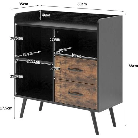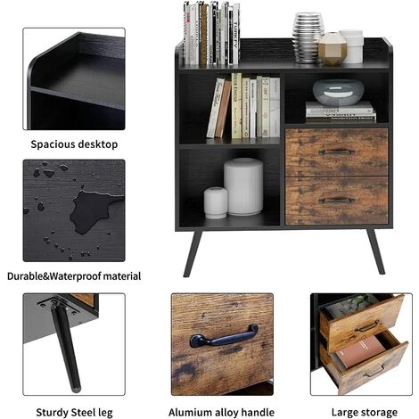 Soges Meuble De Rangement Avec 2 Tiroirs 3 étagères Ouvertes, Armoire Autoportante Avec 4 Pieds, Armoire Latérale D’appoint, Organisateur De Rangement De Buffet En Bois Pour Chambre Bureau à Domicile, FJGS-ST12WT – Noir