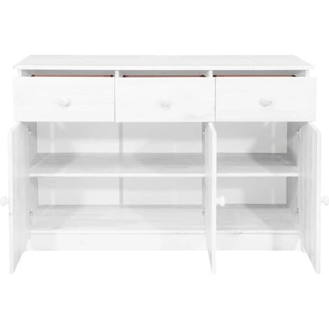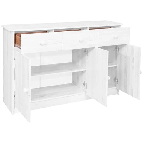 Ce buffet en bois, à l’aspect simpliste s’intègre parfaitement dans tous les styles d’intérieur. Le meuble de rangement est en bois de pin massif, robuste et spacieux. Il tire le meilleur parti de chaque centimètre d’espace dans votre maison. Dispose de 3 tiroirs et de 3 portes, il offre beaucoup d’espace, vous pouvez placer un vase, un cadre photo, des plantes ou d’autres petits objets sur le dessus et ranger vos vêtements, livres, jouets, etc. dans les tiroirs, ce qui rend votre pièce bien rangée.