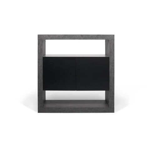 Matériaux : Construction alvéolaire composée majoritairement de panneaux agglomérés à base de bois recyclé. Finition mixte en mélamine effet béton et laque satinée noire.