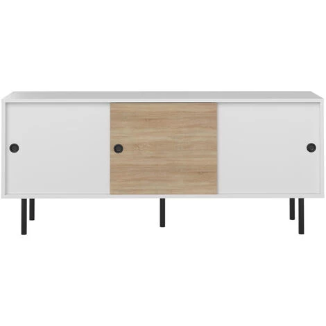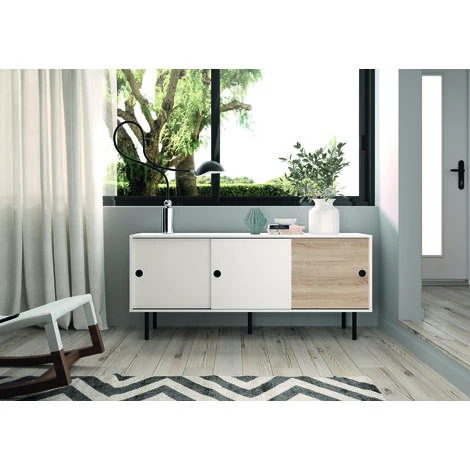 Le buffet ZIP trouvera naturellement sa place dans votre salon, votre salle à manger ou votre bureau. Ses grandes niches fermées par les portes coulissantes sont spacieuses et idéales pour stocker vos objets, vos livres ou votre vaisselle. Ses pieds en métal noir et sa forme simple vous permet un montage facile du meuble. Les 3 portes coulissantes sont interchangeables sur les 2 rails du meuble. Il est cependant indispensable de mettre 2 portes sur un rail et la dernière sur le deuxième pour pouvoir accéder à tous les rangements.