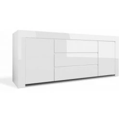 Buffet AMBER blanc• en mélamine résistant aux rayures laqué blanc brillant• nr.3 tiroirs• nr.2 portes avec poignée à gorge• nr.4 étagères internes couleur blanc mat• capacité de charge supérieure max Kg. 30• charge unique tablette max Kg. 10• dimensions du plateau cm. L.54,8 P.46,3 H.40,4• dimensions cm. L.190 P.50 H.82• Made In Italy