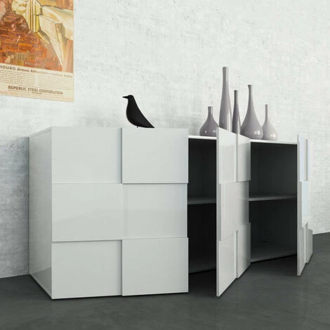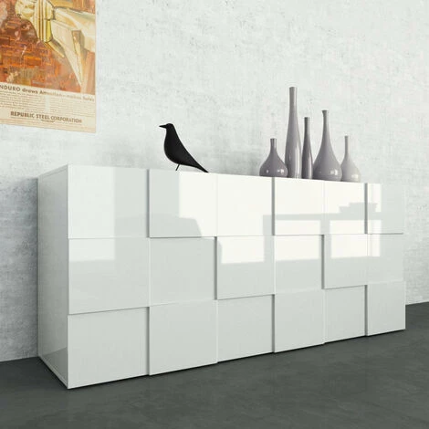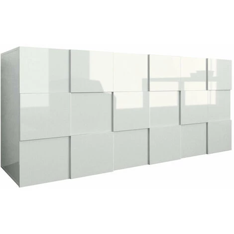 Buffet BRAMON blanc• en mélamine résistant aux rayures laqué blanc brillant• façades réalisées avec effet damier• nr.3 portes avec ouverture réversible dx/sx en cours de montage• nr.6 étagères internes couleur blanc mat• capacité de charge supérieure max Kg. 30• charge unique tablette max Kg. 10• dimensions du plateau cm. L.57,7 P.38• dimensions cm. L.180 P.42 H.84• Made In Italy