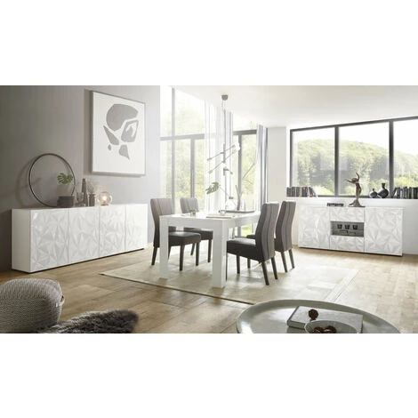 Buffet PRAGUE blanc• en mélamine résistant aux rayures laqué blanc brillant• façades sérigraphiées• nr.4 portes avec ouverture réversible dx/sx en cours de montage• nr.8 étagères internes couleur blanc mat• capacité de charge supérieure max Kg. 30• charge unique tablette max Kg. 10• dimensions cm. L.241 P.42 H.84• Made In Italy