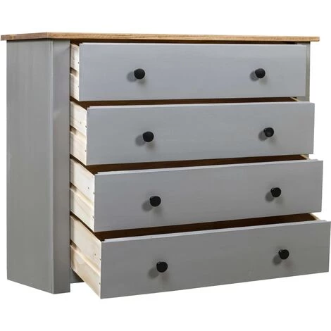 Décorative et pratique, notre armoire latérale sera un excellent supplément à votre intérieur. Elle peut également être utilisée comme support de téléphone à côté de votre canapé ! Fabriqué en bois de pin massif, ce meuble à tiroirs Panama est extrêmement durable et robuste. Le buffet offre un grand espace de rangement avec 4 tiroirs. En outre, le dessus de table robuste est idéal pour afficher des objets décoratifs, des cadres photo ou des plantes en pot. Il est facile d’essuyer avec un chiffon sec. Le support de téléphone est facile à assembler.