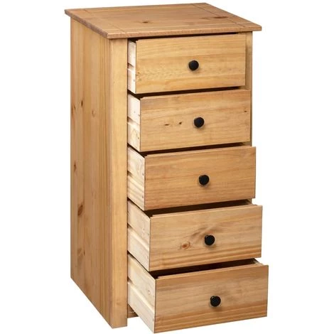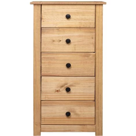 Complétez votre chambre à coucher, votre salon ou votre bureau avec notre buffet en pin massif ! Elle peut également être utilisée comme support de téléphone à côté de votre canapé ! Fabriqué en bois de pin massif, ce meuble à tiroirs Panama est extrêmement durable et robuste. Le buffet offre un grand espace de rangement avec 5 tiroirs. En outre, le dessus de table robuste est idéal pour afficher des objets décoratifs, des cadres photo ou des plantes en pot. Il est facile d’essuyer avec un chiffon sec. Le support de téléphone est facile à assembler.