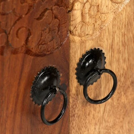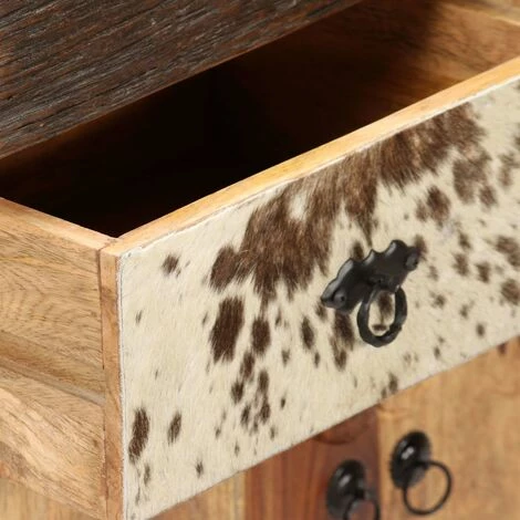 Notre buffet élégant avec un véritable détail en peau de vache et des décorations sculptées à la main sera un véritable article attrayant dans votre maison, tout en fournissant une solution idéale pour garder vos objets rangés et sans encombrement hors de votre vue. Fabriqué en bois massif de Sesham, l’armoire latérale est durable, facile à entretenir, et donnera à votre décor une touche de charme rustique. Le Sesham est un bois dur tropical qui est célèbre pour ses fibres riches et aussi connu sous le nom de bois de rose ou palissandre. Les beaux grains de bois rendent chacun de nos buffets uniques et légèrement différents les uns des autres. Ce buffet unique est riche en éléments décoratifs, comme les véritables détails en peau de vache, les décorations sculptées à la main et les tirettes de style rétro, qui donnent au meuble son charme unique. L’armoire latérale est supportée par de robustes pieds en acier qui ajoutent également une touche industrielle. L’assemblage est facile. Remarque importante : Les fibres de bois et les motifs en cuir peuvent varier d’une pièce à l’autre, ce qui rend chacun de nos buffets uniques ; la livraison est aléatoire.