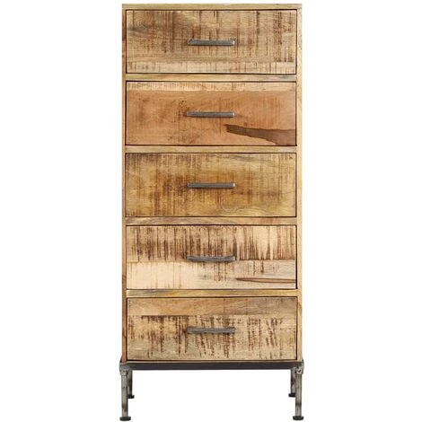 Ce coffre à tiroirs dégage un charme vintage et sera le centre d’attraction de votre intérieur. Ce coffre à tiroirs est fait de bois de manguier massif, un bois dur aux grains denses. Le bois de manguier brut a non seulement la force de supporter le poids, mais il résiste aussi à l’usure du temps. C’est pourquoi cette armoire latérale au design élégant est stable, durable et attrayante. Le travail artisanal et les belles fibres du bois rendent chaque meuble unique et légèrement différent l’un de l’autre. Les poignées en fer renforcent le style industriel de l’armoire latérale. De plus, ce buffet dispose de 5 tiroirs, ce qui vous permet de ranger vos vêtements, livres et autres articles divers. Remarque importante : Les couleurs varient d’une pièce à une autre, rendant chacune d’elle unique ; la livraison est aléatoire.