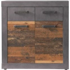 INDY – Meuble chambre. Commode 2 tiroirs en mélaminé coloris gris ciment et 2 portes bois effet vieilli . L – H – P : 82 / 86 / 37cm. 2 etageres Conseil d’entretien : Utiliser un chiffon de coton humide. Ne pas utiliser de nettoyant agressif comportant des additifs. Ne pas utiliser de nettoyeur à vapeur. ***A NOTER *** La livraison comprend 1 colis, pour un total de 36,5kg. Dimensions des colis (LxHxP). *1 : 93,5 x 43,5 x 17 (36,5 kg)