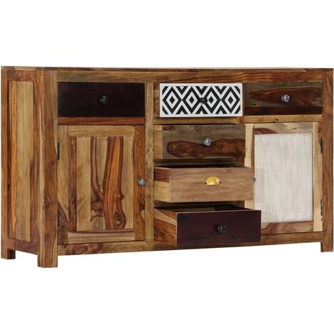 Ce buffet dégage un charme spécial qui ajoutera un élément accrocheur à votre décoration intérieure. Le meuble est fait de bois massif de Sesham, également connu sous le nom de bois de rose ou palissandre, est un bois dur tropical qui est célèbre pour ses grains naturels et sa texture lisse. De plus, il ne se déforme pas, ne se fend pas et résiste à la décomposition naturelle. En conséquence, ce superbe meuble TV est extrêmement stable, durable et accrocheur. La perfection de la fabrication garantit que chaque étape du processus est réalisée avec le plus grand soin, que ce soit le polissage ou le laquage. Notre armoire en bois est entièrement fabriquée à la main et les grains de bois esthétiques rendent chaque pièce unique et légèrement différente l’une de l’autre. Ce buffet dispose de 6 tiroirs et de 2 portes, offrant suffisamment d’espace pour ranger vos appareils multimédia, livres et autres articles divers. Remarque importante : les grains de bois varient d’une pièce à l’autre, rendant chaque pièce unique ; la livraison est aléatoire.