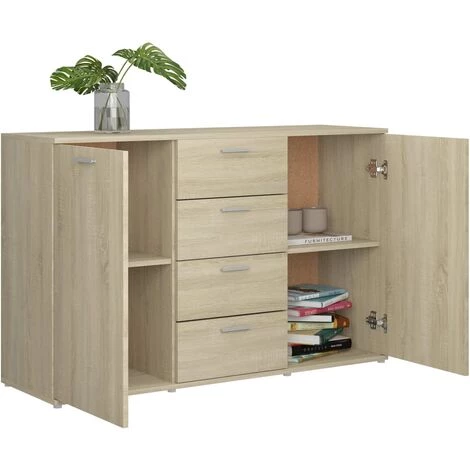 Ce buffet doté d’un design minimaliste sera un ajout pratique mais également très décoratif à votre maison. Avec 2 portes et 4 tiroirs, le buffet offre un grand espace de rangement pour les livres, les appareils multimédia et autres articles. Le dessus de table robuste est idéal pour afficher des objets décoratifs, des cadres photo ou des plantes en pot. Grâce au matériau en aggloméré haut de gamme, ce buffet est stable et conçu pour durer. De plus, l’armoire à tiroirs est facile à nettoyer avec un chiffon humide. Cet article est facile à assembler.