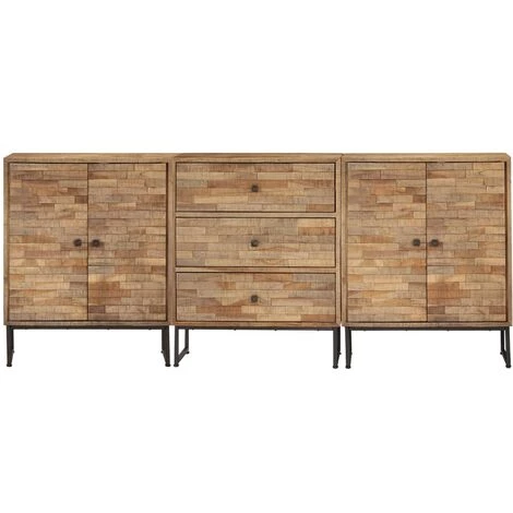 Ces buffets en teck recyclé sont des accessoires intemporels pour votre maison. Ils peuvent être utilisés également comme armoires latérales. Cet ensemble de buffets est fait à la main en bois de teck recyclé, très robuste et durable, avec des caractéristiques naturelles. Chaque étape du processus est réalisée avec le plus grand soin, que ce soit le polissage, la peinture ou le laquage. Le travail artisanal et les beaux grains de bois font de chaque buffet unique et légèrement différent l’un de l’autre. Ces armoires offrent un grand espace de rangement pour garder vos articles importants bien organisés et à portée de main. Les cadres robustes en acier enduit de poudre ajoutent à leur style rétro et industriel. Ces articles sont faciles à assembler. Remarque importante : les couleurs et les grains peuvent varier d’une pièce à l’autre, ce qui rend chacun de nos buffets unique ; la livraison est aléatoire.
