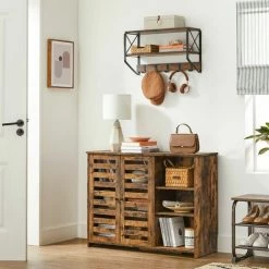 1.Repas sur le thème indus : Le chef vous propose un placard à la surface boisée d’un marron envoûtant et cadre en métal noir industriel, le tout décoré d’une porte façon lamelles, de portes transparentes et d’une grille pour réveiller l’âme de votre salon