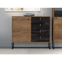 La collection MALONSKI vous permettra de créer une décoration très industrielle grâce à la complémentarité de ses coloris noyer et anthracite. Vous pourrez aisément ranger tous vos effets, accessoires et appareils électroniques puisque cette collection vous propose tout les meubles nécessaires pour un intérieur bien ordonné.