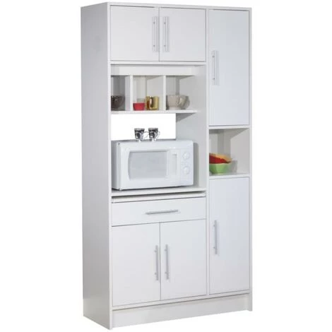 Ce buffet de cuisine est constituĂ© de plusieurs espaces de rangement: 5 placards , 1 grand tiroir, 4 niches, une tablette coulissante et d’un espace spĂ©cialement conçu pour que vous disposiez votre micro-ondes.
