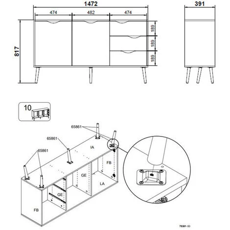 Ce meuble est fabriqué en panneau de contre-plaqué de mélamine, blanc mat ainsi que des détails sur la face du tiroir et des pieds coniques en chêne brut. La grosseur des planches est de 16 mm pour les structures et les faces. Les rebords sont plaqués en ABS. Les armatures sont métalliques et les rails télescopiques du tiroir sont encastrés dans ce dernier.