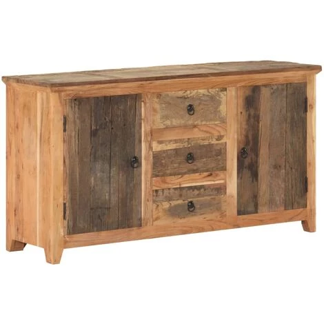 Cette armoire latĂ©rale est en bois massif de rĂ©cupĂ©ration, ce qui rend chaque meuble unique et lĂ©gèrement diffĂ©rent l’un de l’autre. Le bois de rĂ©cupĂ©ration est solide, stable, durable et beau. Les signes d’usure et la structure de grain visible donnent Ă chaque pièce sa propre histoire et un look unique. Le cadre en bois d’acacia massif offre une stabilitĂ© supplĂ©mentaire Ă l’armoire. Elle dispose Ă©galement de deux portes et de trois tiroirs offrant amplement d’espace de rangement pour garder vos articles organisĂ©s et Ă portĂ©e de main. De plus, le dessus robuste est idĂ©al pour exposer des objets dĂ©coratifs tels que des cadres photo, des plantes en pot, des vases, etc.