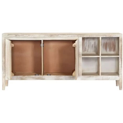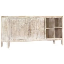 L’armoire est en bois de manguier massif, un bois dur aux grains denses. Le bois de manguier brut a non seulement la force de supporter le poids, mais il résiste aussi à l’usure du temps. Par conséquent, ce meuble au design magnifique est extrêmement stable, durable et esthétiquement attrayante. De plus, ce meuble en bois a une finition blanche pour lui donner un bel aspect et une couleur brillante. Les grains de bois exquis rendent chaque meuble distinctif et légèrement différent l’un de l’autre. Ce dressoir dispose de 4 compartiments et de 2 armoires à 2 portes, offrant suffisamment d’espace pour ranger vos chaussures, livres, ainsi que d’autres articles divers.