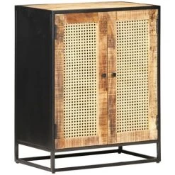 Le bois de manguier massif est un bois dur tropical. Il a d’une part la force de soutenir le poids, et d’autre part résiste à l’usure du temps. De plus, le savoir-faire exquis et les beaux grains de bois rendent chaque pièce d’armoires latérales légèrement différente l’une de l’autre. L’armoire en bois est équipée d’un grand espace de rangement, donc vous pouvez afficher ou garder bien organisés tous les articles que vous souhaitez. Le cadre en fer contribue à sa robustesse et à sa stabilité. De plus, l’armoire de rangement présente un motif de canne tissé à la main sur la porte, ajoutant à son charme rustique.