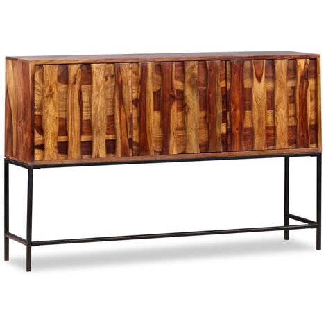 Ce buffet est fait de bois massif de Sesham. Le Sesham, également connu sous le nom de palissandre ou bois de rose, est un bois dur tropical connu pour son grain riche. Ce buffet a un dessus robuste, sur lequel vous pouvez placer des articles décoratifs comme des paniers de fruits ou des vases, pendant que ses jambes fortes en fer forgé contribuent à la construction vigoureuse. Ses armoires offrent amplement d’espace pour garder toutes sortes de petits objets organisés et à portée de main. Il est entièrement fait à la main et les beaux grains de bois rendent chaque meuble unique et légèrement différent l’un de l’autre.