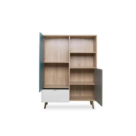 Buffet haut design avec pieds en bois, 2 portes 1 tiroir, finition Chêne, Blanc, Pétrole et Gris