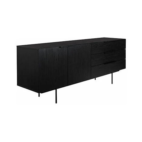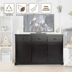 Votre souhait est d’avoir un espace de vie agréable, offrez-vous ce buffet 2 portes et 3 tiroirs décor chêne noir de la gamme TRAVIS. Il a une structure en panneaux de particules avec placage de chêne laqué noir. Ses poignées sont en acier. Le cadre est en acier peint avec des embouts de pied en plastique réglables. Sa solidité et sa longévité sont donc certaines. Il est doté de tiroirs et de portes à fermeture douce avec une étagère pour un rangement optimal de votre vaisselle et argenterie. Son coloris noir lui donne une beauté exceptionnelle.